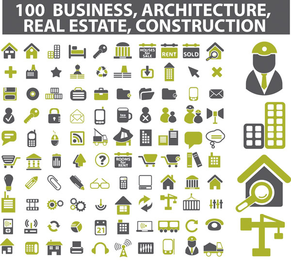Large set of 100 vector icons featuring business, real estate, buildings, construction and architecture – EPS file.