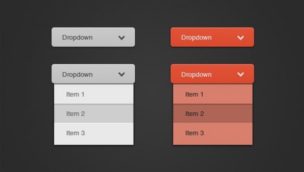 2 Quality made flat dropdown menus set with pressed state – grey and juicy orange colors. PSD and CSS formats