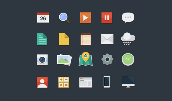 20 Colorful flat desktop icons set – clock, settings, map, photos, weather, player, search, calendar, notes, mail, calculator, and more – PSD.