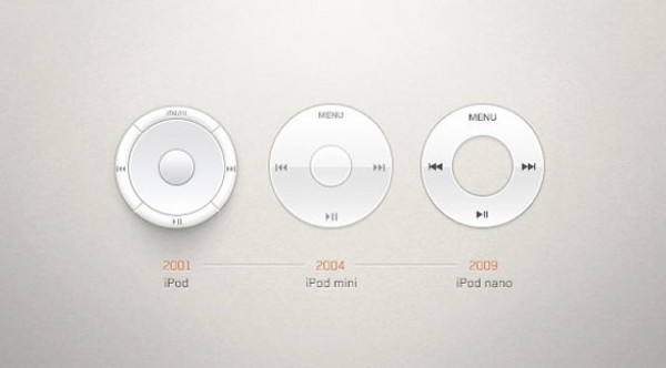 3 iPod click wheels showing the evolution from the iPod 3D style to flat iPod Nano – PSD.