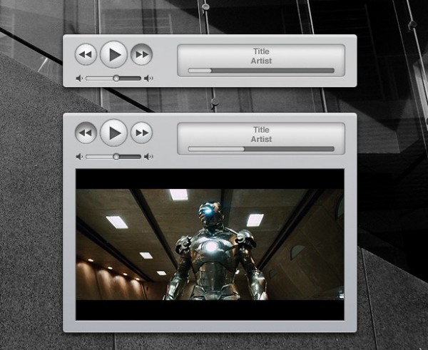 Light grey iTunes media player controls interface with screen – PSD.