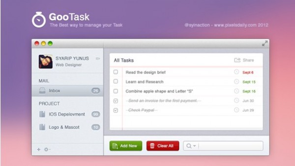 Amazing full fledged task manager / to-do list application interface, styled for OS X. It contains various sidebar items, a task list on the right, buttons to enter/clear items – the best way to manage your tasks. PSD
