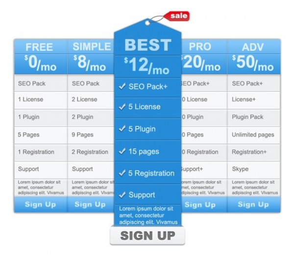 Clean, grey and blue UI pricing table with 5 columns in PSD.