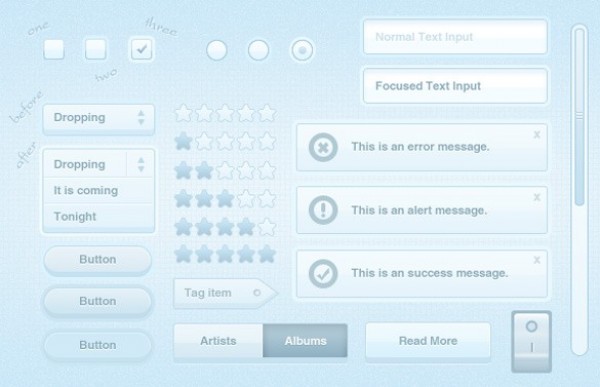 Clean blue web UI elements kit – slider, checkboxes, notification and dropdown buttons, input field and star rating – PSD.