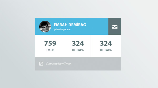 Fresh blue Twitter Tweet profile widget with mail icon – PSD.