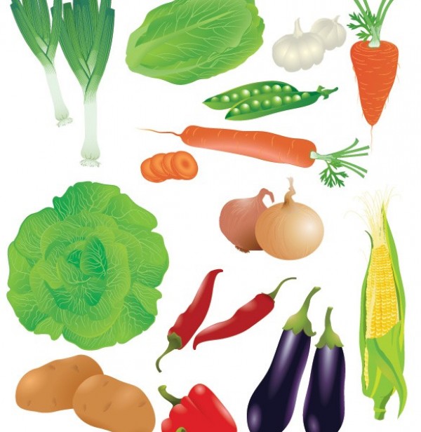 Fresh vector veggies – carrots, onions, lettuce, peas, garlic, peppers, corn, eggplant, potatoes, watermelon and pumpkin.