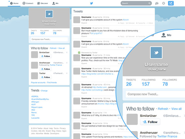 Fresh and new Twitter 2 column redesign created with flat, UI elements in PSD.