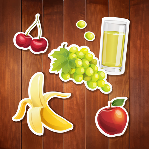 Name: Food stickers and wood background creative vectors 02