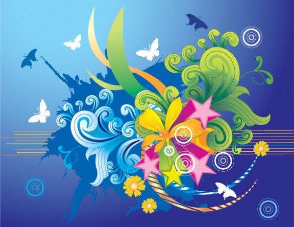 Flowers, stars and butterflies blue abstract vector background in EPS format.