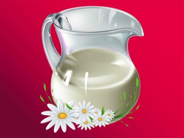 Clear glass pitcher of milk with bouquet of fresh daisies – vector illustration in Ai and PDF format.