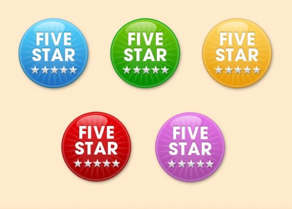5 Glossy round badges with 5 stars in 5 colors – editable psd.