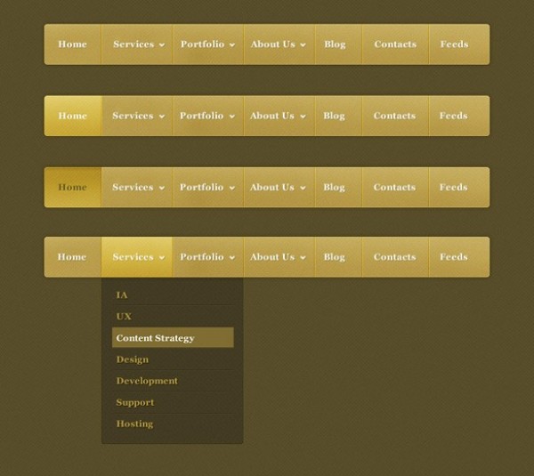 A gold toned dropdown Menu Bar fully editable, with hover and active states.