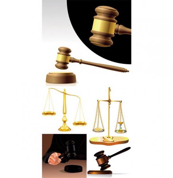 Justice themed vector graphics – gavel, judge, scales of justice.