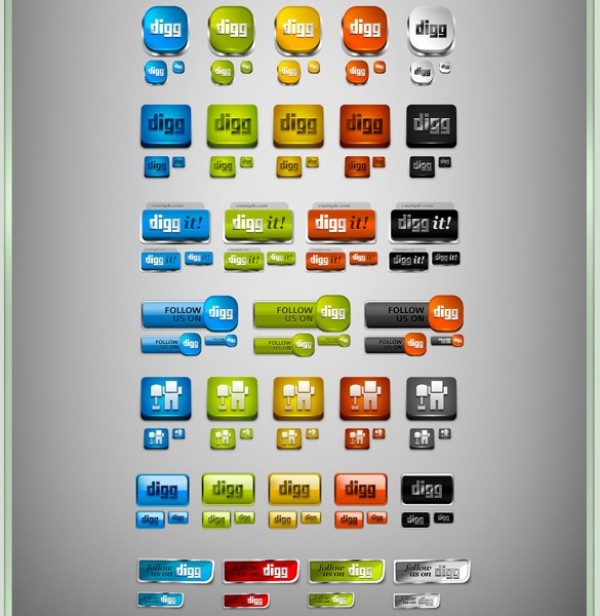 Incredible collection of DIGG social networking icons – five colors and three size variations PNG as well as PSD file.