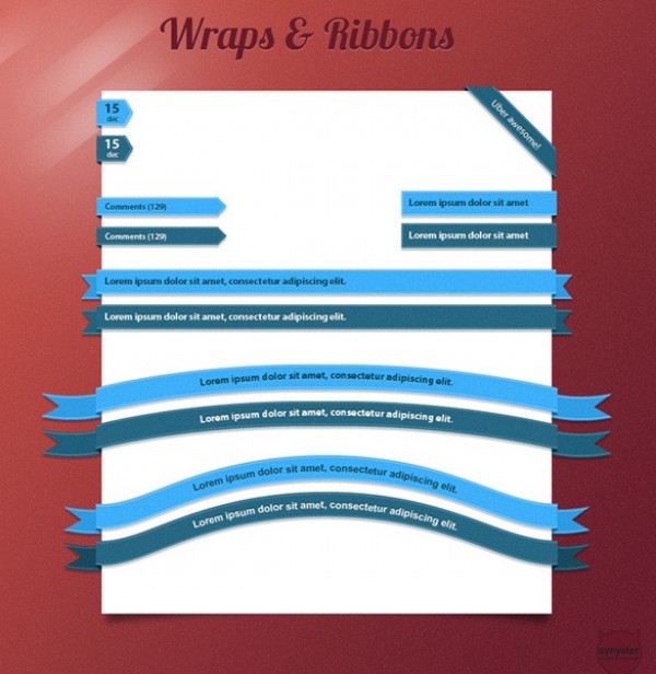 Slim sweet blue ribbons and corner wraps UI elements in PSD.