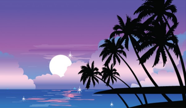 Moonlight in the tropics – silhouette palms by the ocean vector background.
